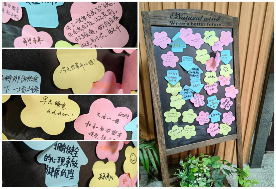 活动设置了“心理健康知识问答”、“我与心理健康标语合影”和“打卡分享”三个环节,并为每一位参加活动的同学准备了温馨礼品。活动开始第一天,心理健康工作室便迎来90余名同学前来打卡,活动累计参与200余人次。大家认真参观工作室,积极参与答题及合影,互相交流心理健康观念,翻阅心理健康书籍,许多同学在离开前主动写下温馨寄语,传递温暖。